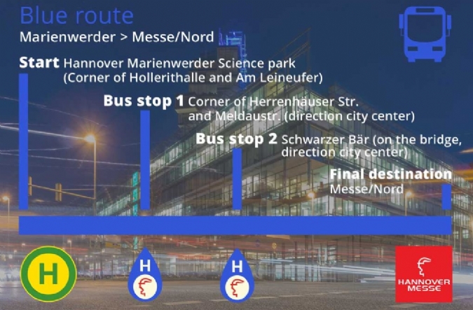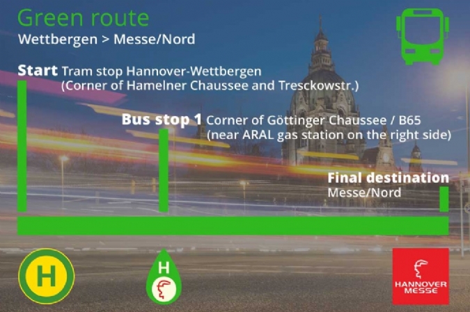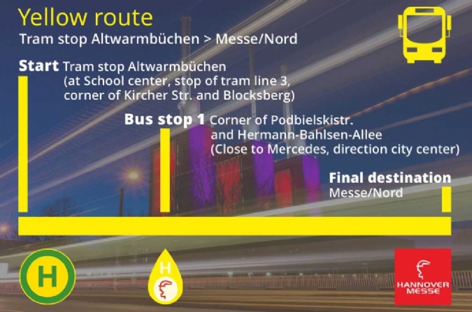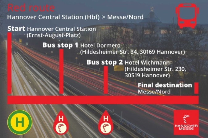 針對于周二要前往參加漢諾威工業博覽會的展商和觀眾,漢諾威展覽公司將提供接駁巴士服務。接駁巴士將從城市的西面、北面、東面出發,每半小時一班,接送乘客到展會現場。另外,也將有一條額外的線路,每半小時一班,從中央火車站(輕軌Hauptbahnhof站)出發前往展會。每條線路都會有相應的經停站來接送沿線的展商和觀眾。
