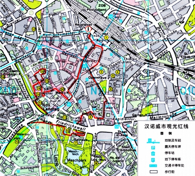 漢諾威市中心最重要的36個景點被一條“紅線”串聯起來,這是一條畫在地面上紅色的環線,總長4.2千米。